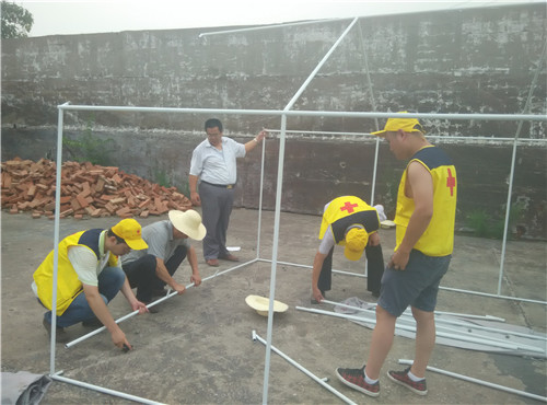 当天,为应对即将到来的强降雨,区红会组织24名志愿者到荆蒲兰紧急搭建救灾帐篷,选择地势高、地面平坦的四矿水泥厂厂区,搭建起帐篷6顶,分别设置了临时救护站、防疫站、卫生站和救助站,为灾后防疫灭病、存放和发放救灾物资提供了安全场所,区委组织部、统战部、妇联、环保局的志愿者参加了这次救灾行动。