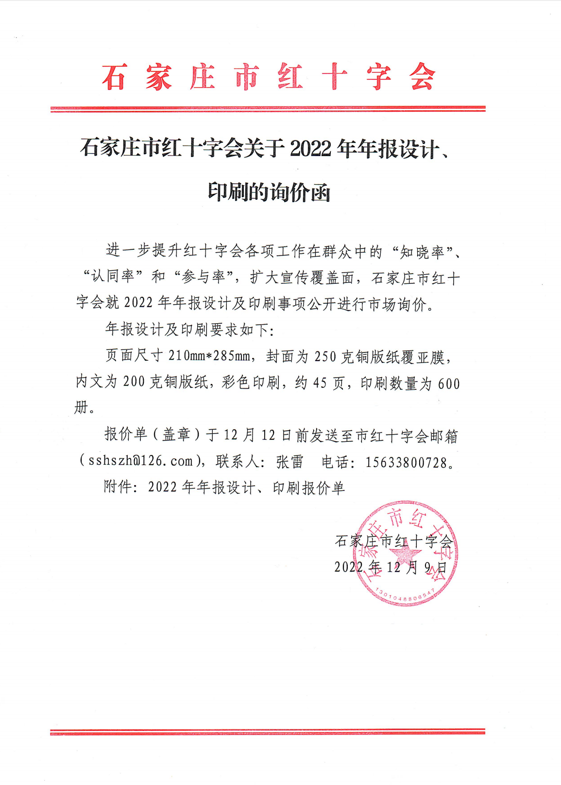 石家庄市红十字会关于2022年年报设计、印刷的询价函