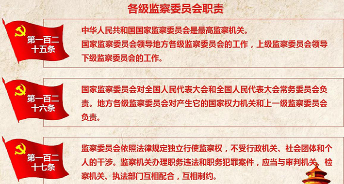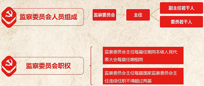 宪法第一百二十四条规定:“中华人民共和国设立国家监察委员会和地方各级监察委员会。监察委员会由下列人员组成:主任,副主任若干人,委员若干人。监察委员会主任每届任期同本级人民代表大会每届任期相同。国家监察委员会主任连续任职不得超过两届。监察委员会的组织和职权由法律规定。”这明确了监察委员会的基本构成要素。依据宪法规定和改革实践,正在制定的监察法将要对国家、省、市、县设立监察委员会作出具体规定。国家一级监察委员会名称前冠以“国家”,体现由行政监察“小监察”变为国家监察“大监察”,表明了最高一级国家机构的地位;地方各级监察委员会名称采用行政区划+“监察委员会”的表述方式。监察委员会主任由本级人民代表大会选举产生,副主任和委员由主任提请本级人民代表大会常务委员会任免。各级监察委员会可以向本级党的机关、国家机关、经法律法规授权或者委托管理公共事务的组织和单位以及所管辖的行政区域、国有企业等派驻或者派出监察机构、监察专员。监察机关的主要职能是调查职务违法和职务犯罪,开展廉政建设和反腐败工作,维护宪法和法律的尊严;主要职责是监督、调查、处置;主要权限包括谈话、讯问、询问、查询、冻结、调取、查封、扣押、搜查、勘验检查、鉴定、留置等。
