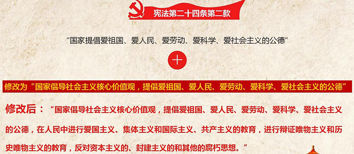 宪法修正案将宪法第一章《总纲》第二十四条第二款中“国家提倡爱祖国、爱人民、爱劳动、爱科学、爱社会主义的公德”修改为“国家倡导社会主义核心价值观,提倡爱祖国、爱人民、爱劳动、爱科学、爱社会主义的公德”。