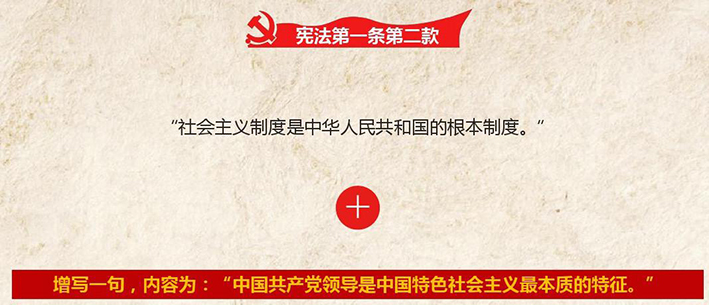 宪法修正案在宪法第一章《总纲》第一条第二款“社会主义制度是中华人民共和国的根本制度。”后增写一句,内容为“中国共产党领导是中国特色社会主义最本质的特征。”