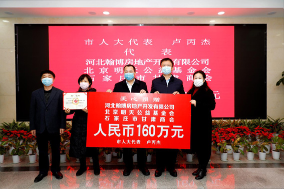 2月14日上午,石家庄市人大代表卢丙杰代表个人及旗下单位翰博房地产开发有限公司、北京明天公益基金会、石家庄甘肃商会向桥西区红十字会捐款160万元,用于桥西区抗击新冠肺炎疫情工作,这也是桥西区红十字会应对疫情发布接收捐款账号以来收到的单笔最大数额捐款。