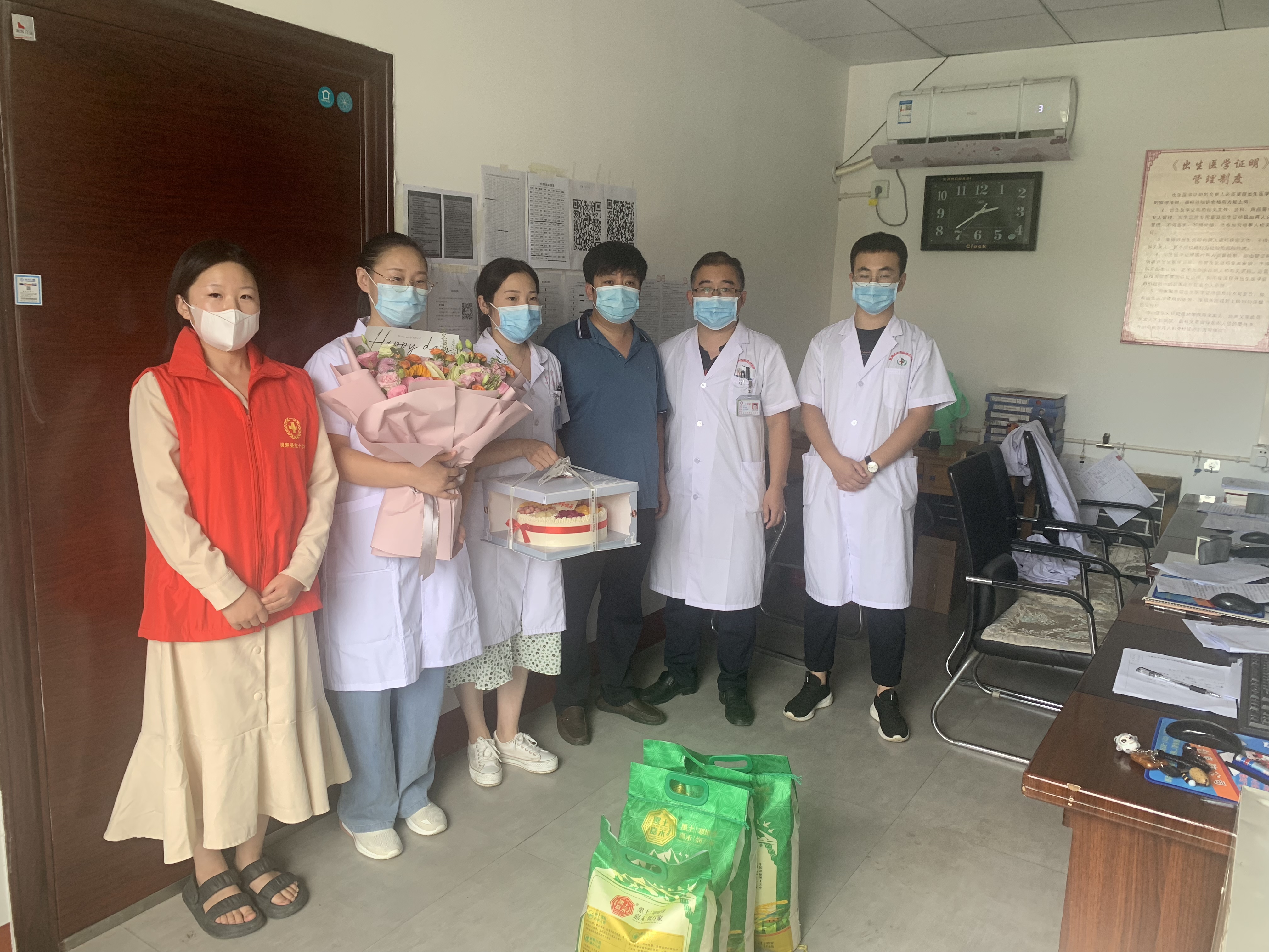 8月19日中国医师节,灵寿县红十字会秘书长张军辉带领志愿者慰问了灵寿县中西医结合医院义诊活动中的红十字志愿者和应急救护师资队伍中的医生们,此次慰问为他们送去了大米20袋、节日蛋糕及鲜花等慰问物品。