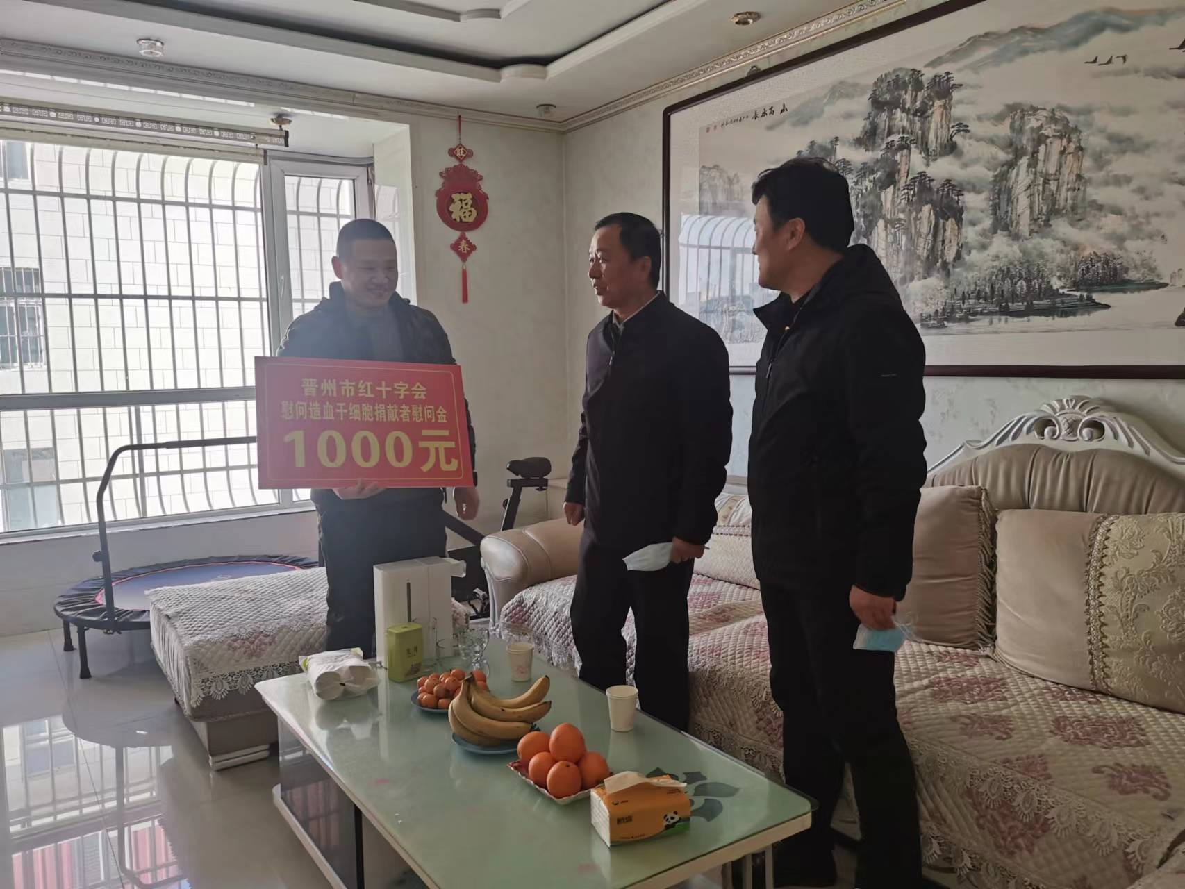 1月16日,晋州市委副书记尹立仓同志慰问我市造血干细胞捐献者,晋州市红十字会负责同志陪同参加。尹立仓一行为造血干细胞捐献者彭诚送去了1000元慰问金和米、面、油等慰问品。