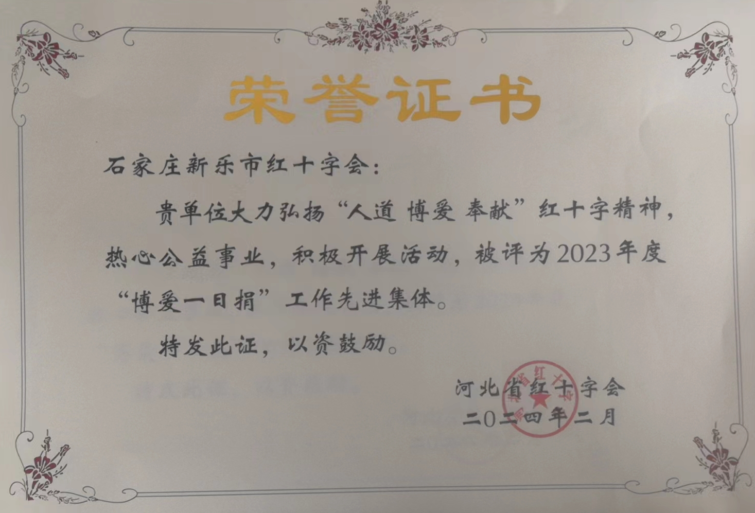 新乐市红十字会获评2023年度“博爱一日捐”省级先进集体