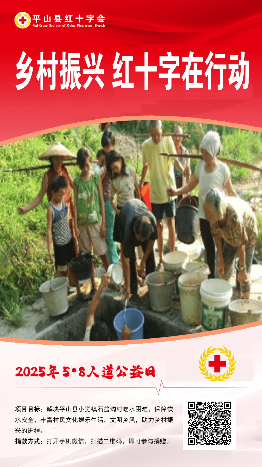 今年“5·8人道公益日”众筹活动,平山县红十字会将重点参与4个项目。1.“共建博爱家园 助力乡村振兴”项目网络筹资用于为5个平山县级红十字博爱家园建设物资器具库,打造红十字特色活动,提高村民应对自然灾害的能力和自救互救能力,提升农村治理水平,实现打通人道服务的“最后一公里”。2.“乡村振兴 红十字在行动”项目网络筹资用于解决平山县小觉镇石盆沟村吃水困难,保障饮水安全,丰富村民文化娱乐生活,文明乡风,助力乡村振兴的进程。3.“红十字帮扶救助困境家庭”项目网络筹资通过为困境家庭提供经济援助、心理辅导、教育资源等综合性的援助措施,激发困境家庭的内在潜力,帮助他们实现自我价值,最终实现社会的共同进步和繁荣。4.“博爱送万家”项目网络筹资主要用于元旦春节期间为困难家庭送去温暖家庭箱(价值300元的米、面、油、棉服等)。