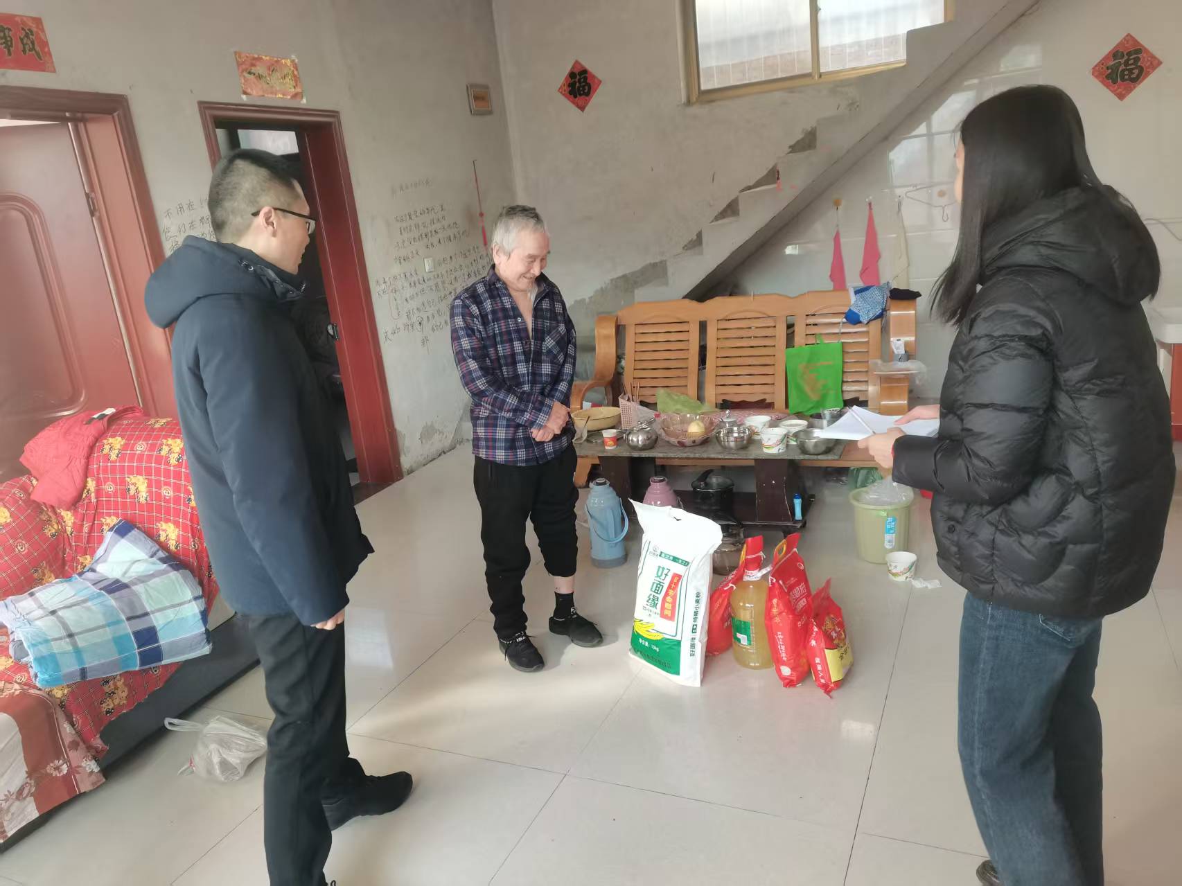 2月12日,区红十字会工作人员一行先后深入后小梅、韩家庄、西羊市、冶河村、西高村,在各乡镇负责人的陪同下,走访慰问困难家庭,与他们亲切交谈,仔细询问生活及健康状况,为他们送去了米、面、油、棉衣棉褥慰问品,同时也送去了党和政府的关怀和新春祝福。