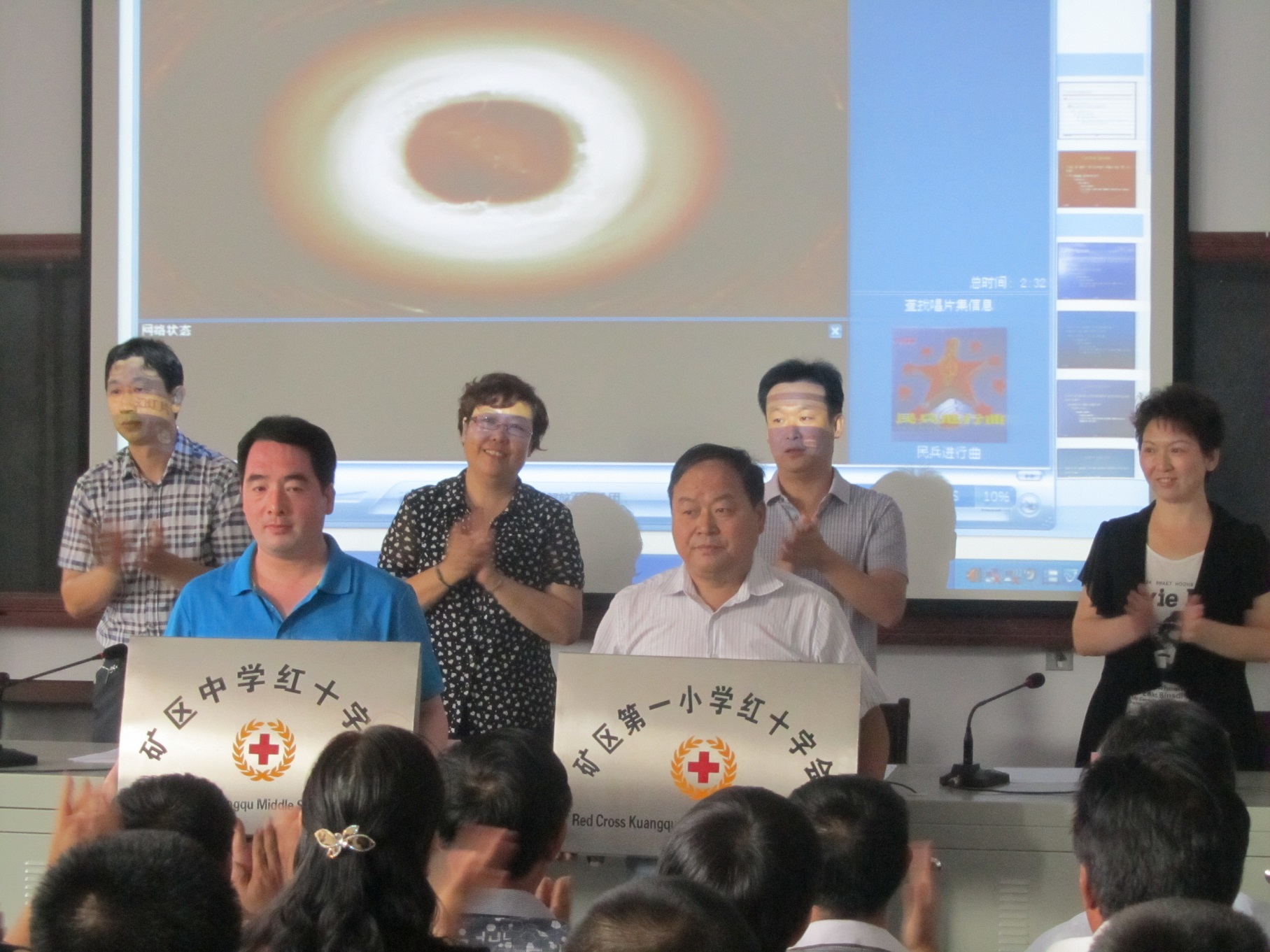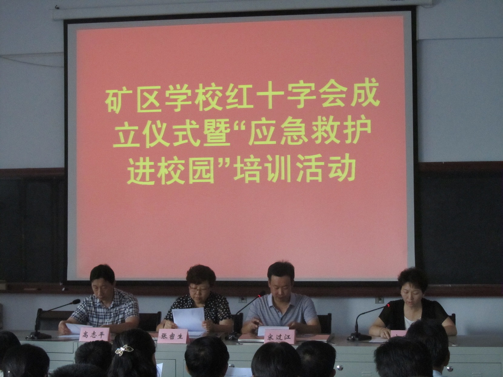 在学校红十字会成立仪式上,区学校红十字工作委员会、矿区中学红十字会和矿区第一小学红十字会宣告成立,区红十字会、区教育局负责人向矿区中学红十字会、矿区第一小学红十字会授牌,两所学校红十字会会长作表态发言。区教育局、区体育局、区红十字会、团区委、区疾控中心、各学区、各学校主要负责人以及高一部分新生,共计300余人参加。