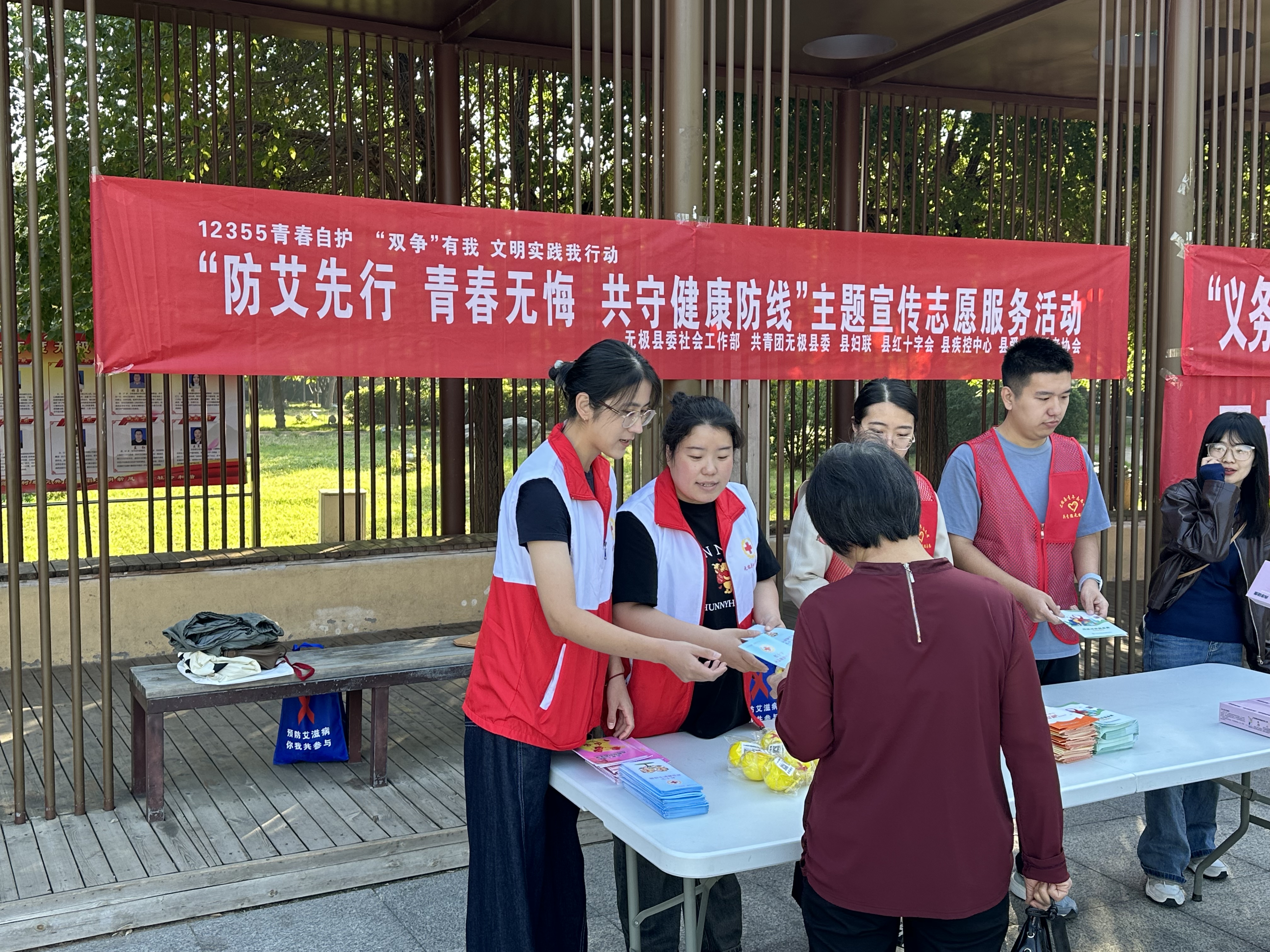 为加强防艾宣传教育,提高自我安全防护意识,增强对艾滋病相关知识的普及,9月23日,无极县红十字会联合无极县委社会工作部、共青团无极县委、县妇联、县疾控中心、县爱心志愿者协会在平安公园开展了以“防艾先行,青春无悔,共守健康防线”为主题的宣传活动。
