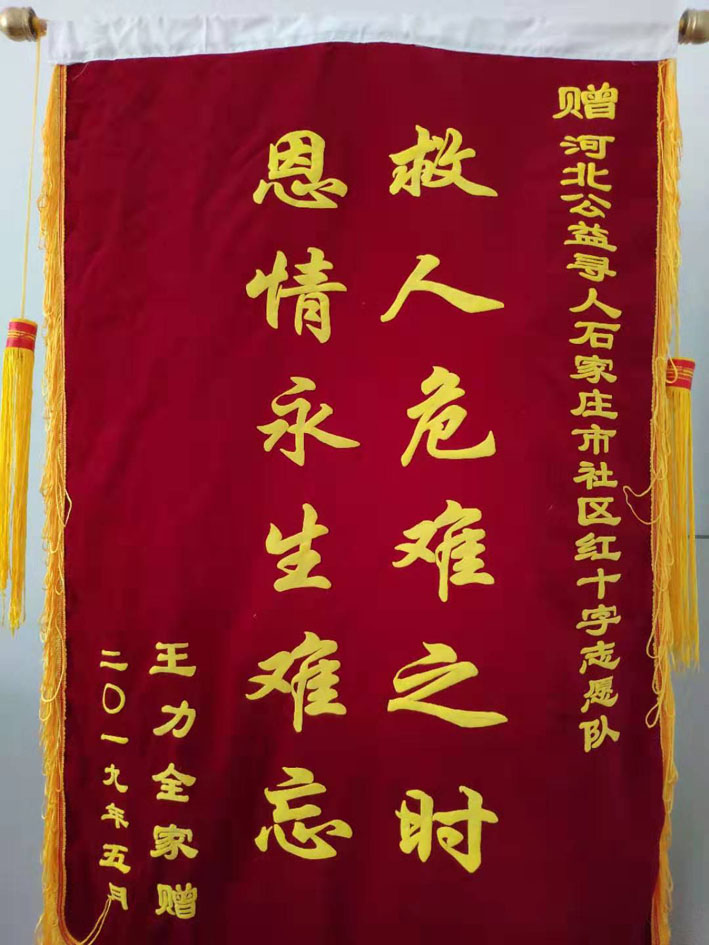 5月27日早上,王先生14岁的儿子王子宁从石家庄市鹿泉区的家出发去上学,途中失联,多方寻找未果,无奈之下,王先生报警求助。警方及时发布了寻人信息,石家庄市社区红十字志愿服务队的志愿者在电视及网络上看到此消息后,立即在微信群内发布消息,并开展寻人行动。志愿者们分几个方向进行寻找,一路查找监控、拿照片问询,不顾天气炎热,顾不上吃饭喝水,千方百计的四处奔走询问,经过不懈的努力,5月29日下午3点40分,走失少年终于在张鑫、张星会、郑卫东等志愿者的帮助下找到了,孩子平安无事,孩子父母感动万分,对志愿者感激不尽。特地给社区红十字志愿服务队送去了一面锦旗表示感谢。