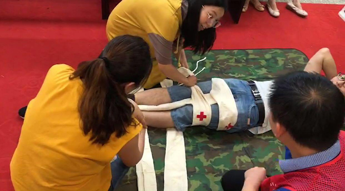 现场演示腿部创伤包扎方法