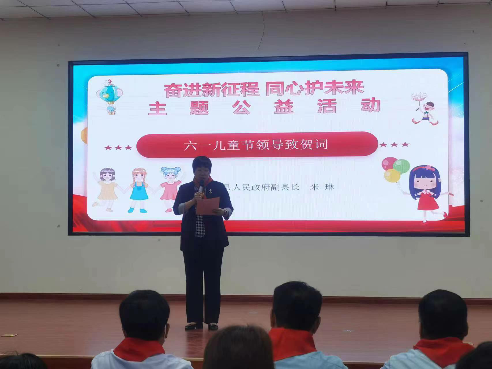 活动中,副县长米琳致节日贺词,强调少年智则国智、少年强则国强、少年进步则国进步。从现在起,希望少年儿童树立理想的航标,继承和发扬中华民族的传统美德,讲文明、懂礼貌,在自学、自护、自强、自律的磨练中,不断提高自理能力、动手能力和创新能力。鼓励困境、留守儿童互相帮助,发扬红十字“人道 博爱 奉献”精神,争取学有所成。
