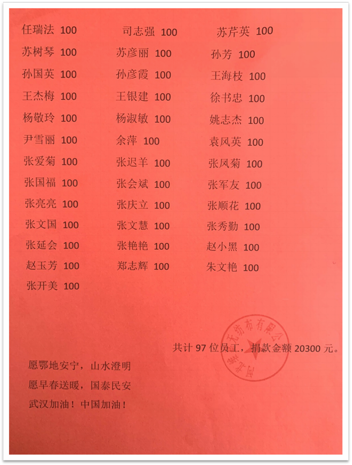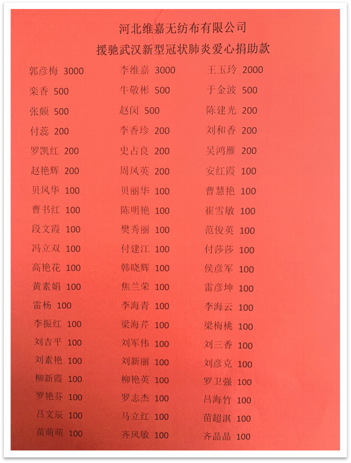 1月31日,维嘉无纺布有限公司向灵寿县红十字会捐款100000元,97名职工自愿捐款20300元,共计捐款120300元。用于支援武汉新型冠状病毒感染的肺炎疫情防控,这也是灵寿县红十字会收到的首笔定向武汉疫防控捐款。