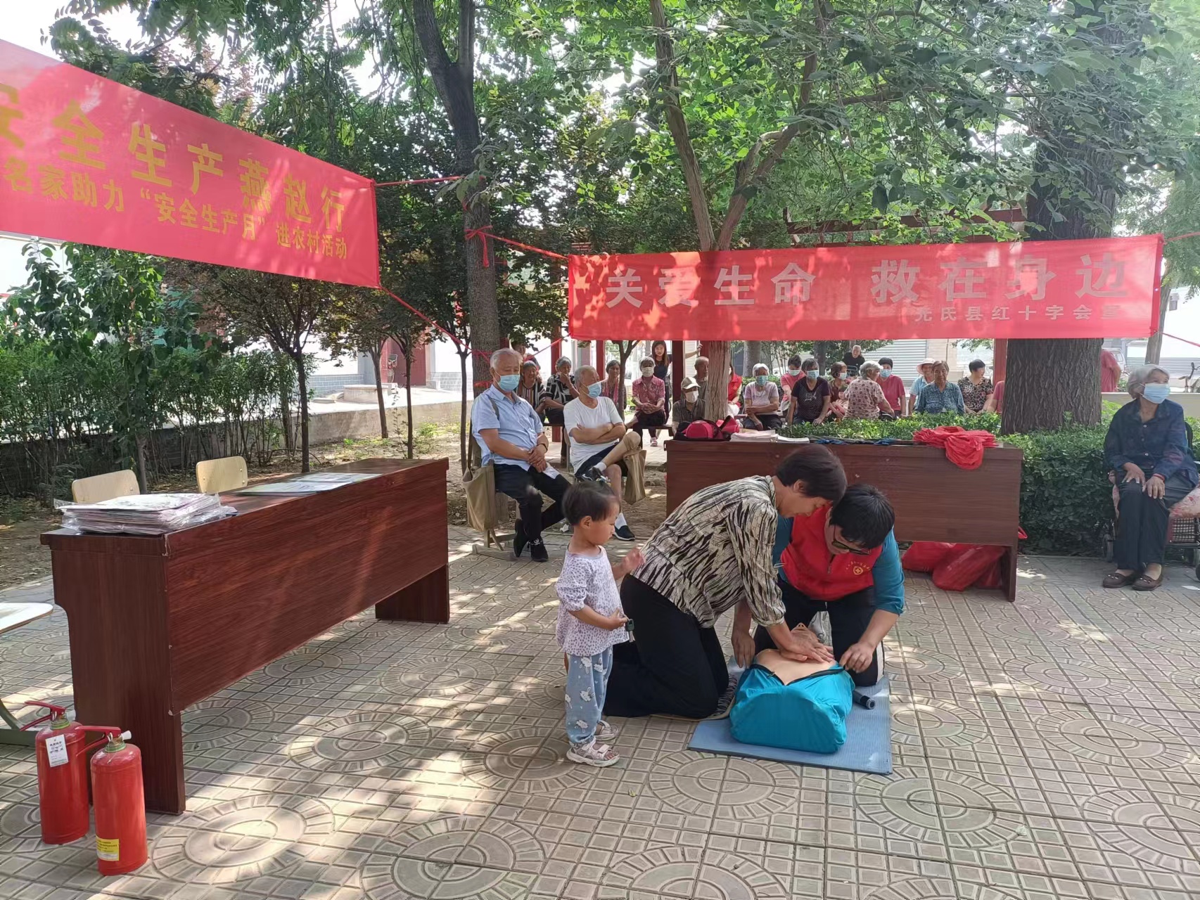 活动中,红十字应急救护培训师资针对应急救护知识及心肺复苏实际操作进行了详细讲解,针对夏日易发溺水事件,重点提醒各位家长要管好少年儿童,远离河沟池塘等不明水域,不要私自下水游泳,切记不盲目施救,预防溺水,珍爱生命。红十字志愿者针对麦收期间防火、防机械伤害等安全知识进行了普及。重点讲解农村安全用电、安全用气、厨房用火等安全知识,并进入村民家庭,讲解演示厨房安全操作常识,进行灭火器现场灭火演示。活动中发放安全教育宣传册 100份。