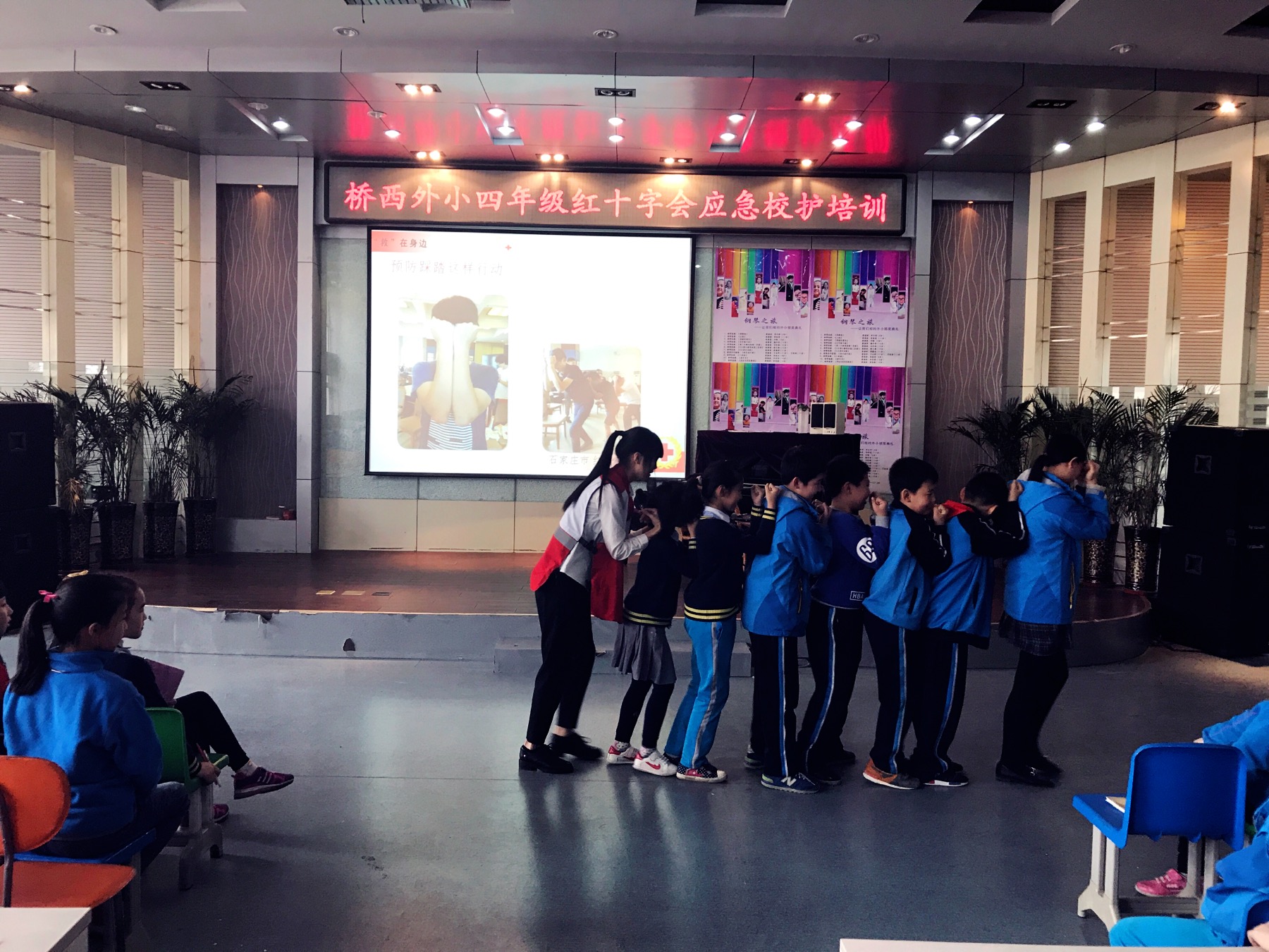 通过理论讲解和实际操作相结合的方式,对四年级全体学生和老师进行了应急救护知识培训,并结合一些具体案例,重点介绍了火灾、溺水、踩踏等突发事故现场的避险与抢救技巧。