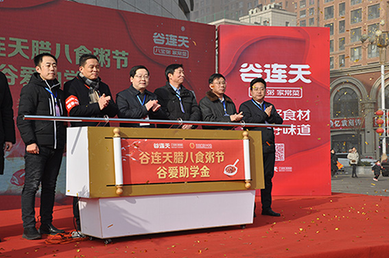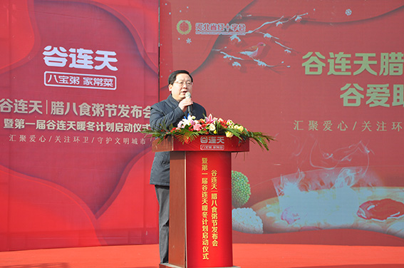 送粥活动结束后,当天上午十点,谷连天腊八食粥节发布会暨第一届谷连天暖冬计划启动仪式在谷连天怀特店前广场举办。河北省红十字会党组成员、秘书长任献强,党组成员、业务部部长牛志强,石家庄市红十字会党组书记、常务副会长王鹏飞参加启动仪式。
