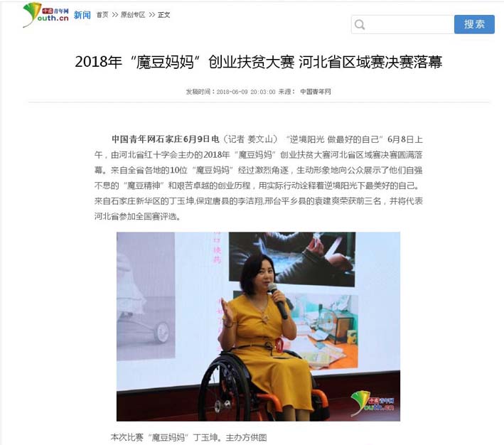 “魔豆爱心工程”,为300余名困难母亲进行了免费培训,帮助76位贫困母亲走上了致富之路。2018年“魔豆妈妈”丁玉坤获得创业扶贫大赛河北省区域赛决赛一等奖。