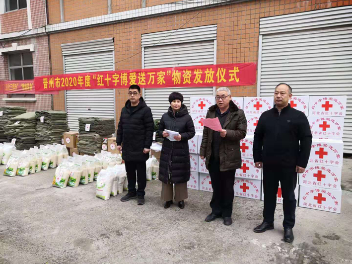 1月15号下午,石家庄市2020年度“红十字博爱送万家”活动启动仪式在晋州市举行。石家庄市红十字会党组成员、秘书长郝瑞起,晋州市红十字会常务副会长李彩敏,秘书长赵川参加启动仪式。红十字志愿者、困难职工、家庭、环卫工人代表等共计100余人参加活动。