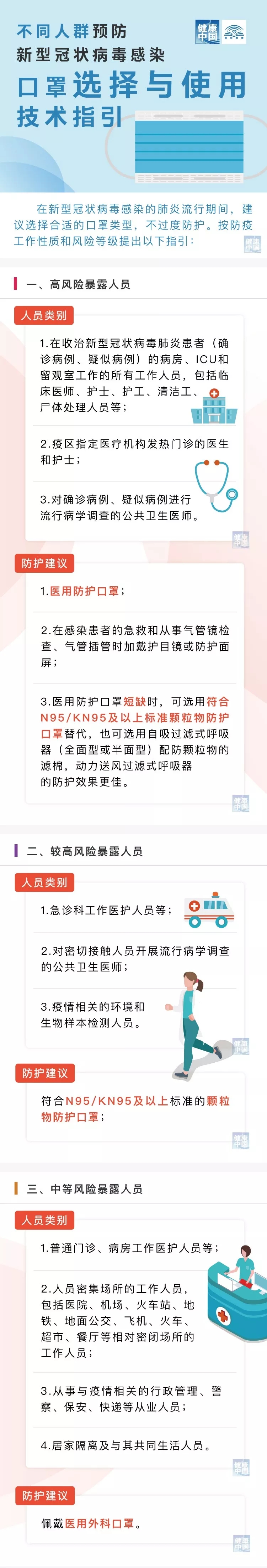 在新型冠状病毒感染的肺炎流行期间,为指导不同人群科学合理地选择和使用口罩,严防新型冠状病毒感染的肺炎疫情蔓延和扩散,国家卫健委疾病预防控制局于2月4日制定发布了《不同人群预防新型冠状病毒感染口罩选择和使用技术指引》。