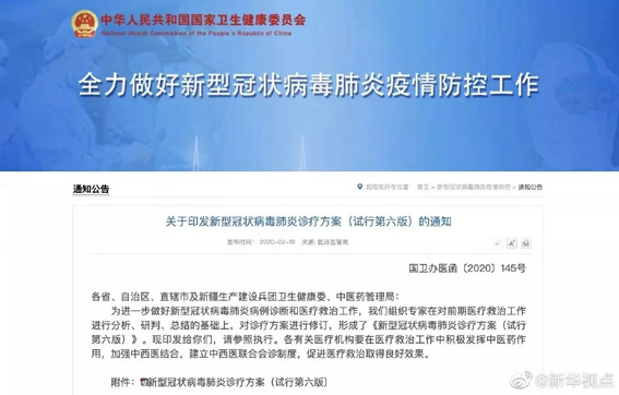 国家卫生健康委办公厅、国家中医药管理局办公室最新发布《新型冠状病毒肺炎诊疗方案(试行第六版)》,传播途径将“经呼吸道飞沫和接触传播是主要的传播途径”改为“经呼吸道飞沫和密切接触传播是主要的传播途径。”“接触”前增加“密切”二字。增加“在相对封闭的环境中长时间暴露于高浓度气溶胶情况下存在经气溶胶传播的可能。” 《新型冠状病毒肺炎诊疗方案(试行第六版)》解读 2020年2月19日国家卫生健康委员会发布了《新型冠状病毒肺炎诊疗方案(试行第六版)》(以下简称“第六版”),现进行解读如下。 一、传播途径 传播途径将“经呼吸道飞沫和接触传播是主要的传播途径”改为“经呼吸道飞沫和密切接触传播是主要的传播途径。”“接触”前增加“密切”二字。增加“在相对封闭的环境中长时间暴露于高浓度气溶胶情况下中存在经气溶胶传播的可能。” 二、临床表现 重症患者严重者除了“快速进展为急性呼吸窘迫综合征、脓毒症休克、难以纠正的代谢性酸中毒和出凝血功能障碍”外,还可出现“多器官功能衰竭”。 实验室检查,强调“为提高核酸检测阳性率,建议尽可能留取痰液,实施气管插管患者采集下呼吸道分泌物,标本采集后尽快送检。” 三、诊断标准 第六版诊断标准取消湖北省和湖北省以外其他省份的区别。统一分为“疑似病例”和“确诊病例”两类。 2.抗病毒治疗:删除“目前没有确认有效的抗新型冠状病毒治疗方法。”在试用药物中,增加“磷酸氯喹(成人500mg,每日2次)和阿比多尔(成人200mg,每日3次)”两个药物。利巴韦林建议与干扰素或洛匹那韦/利托那韦联合应用。试用药物的疗程均不超过10天。建议在临床应用中进一步评价目前所试用药物的疗效。不建议同时应用3种及以上抗病毒药物,出现不可耐受的毒副作用时应停止使用相关药物。