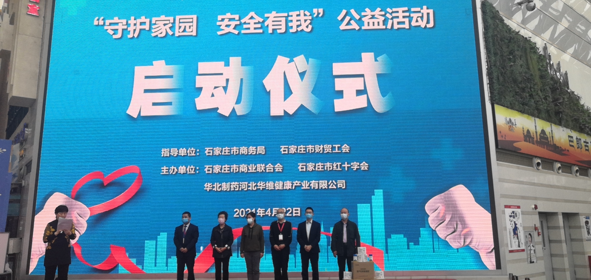 4月22日下午,“守护家园、安全有我”公益活动在勒泰购物中心五层共享空间正式启动。石家庄市红十字会党组成员、秘书长郝瑞起,石家庄市商务局流通业发展处处长马春娟,石家庄市财贸工会主席曹春清,华药集团华维健康产业副总裁回宏宇,华北制药河北华维健康产业有限公司销售总监孙涛,石家庄市商业联合会会长张香蒲等出席启动仪式。