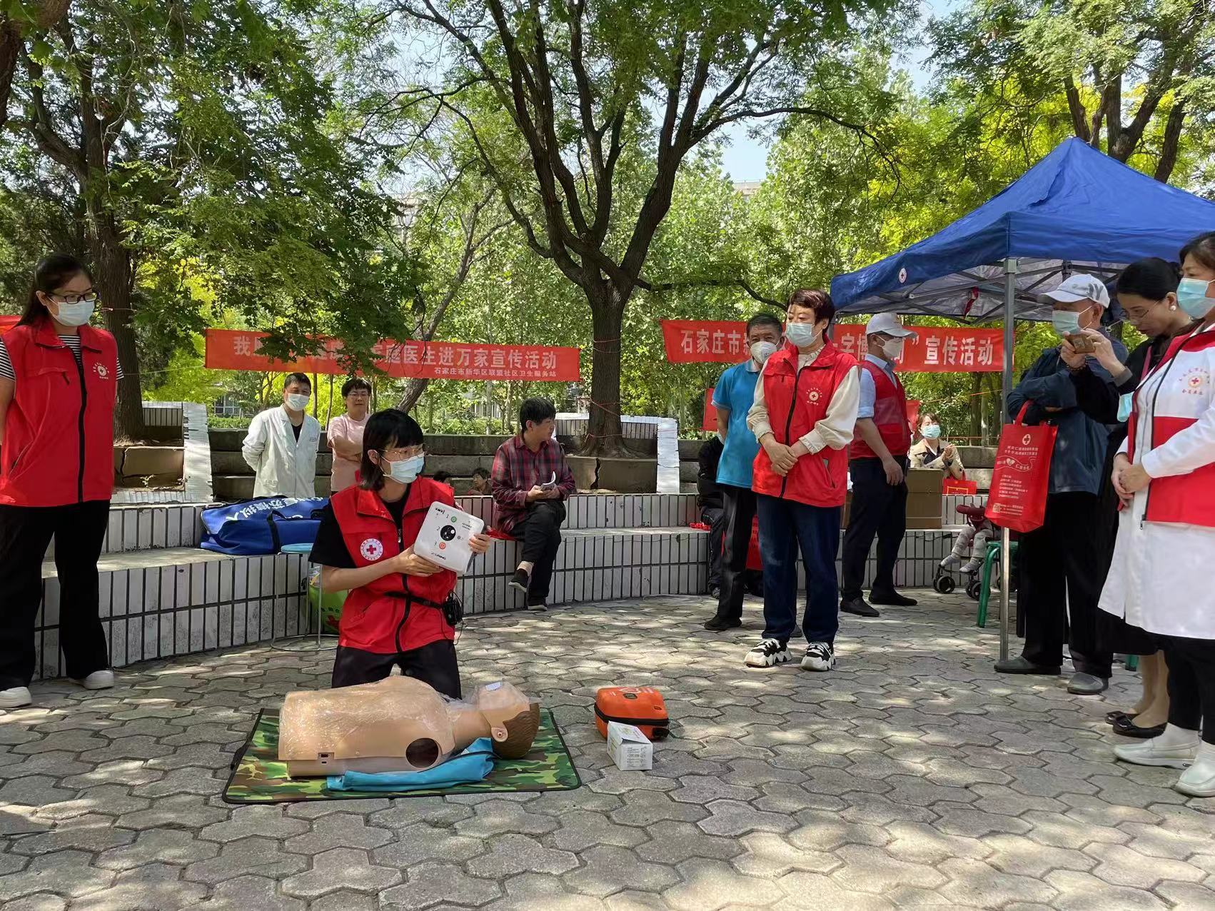 河北中医学院的学生演示了心肺复苏术,并针对如何使用AED(自动体外除颤器)进行讲解。演示结束后,红十字志愿者代表进行健步走宣传,省、市30余家医疗会员单位为市民进行义诊,全市15家红十字医疗会员单位参加义诊,共接诊群众上千人,发放宣传资料宣传品一万余份。