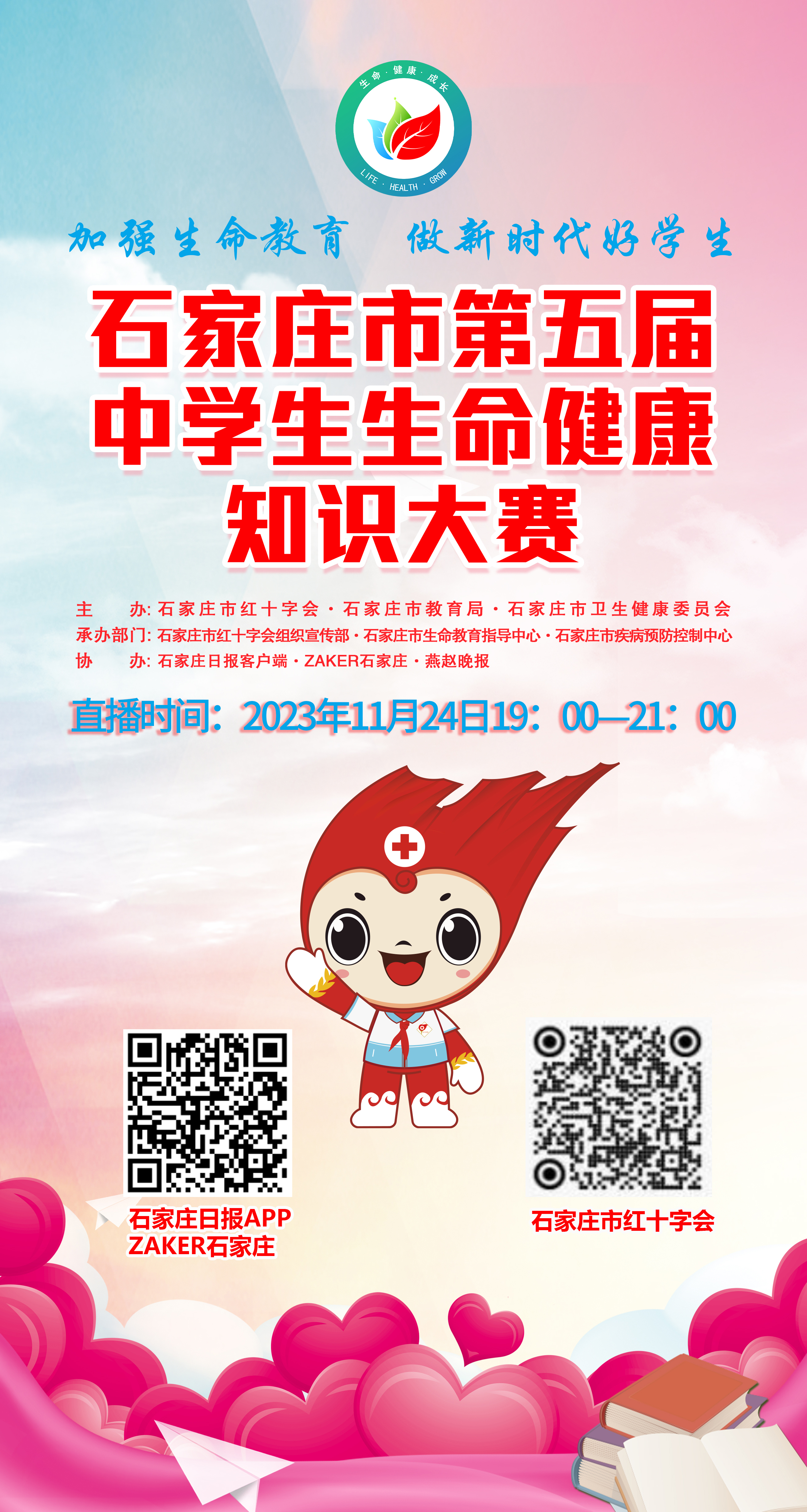 为深入贯彻落实中国红十字会总会、教育部《关于进一步加强和改进新时代学校红十字工作的通知》、教育部等五部门《关于全面加强和改进新时代学校卫生与健康教育工作的意见》和《中华人民共和国传染病防治法》有关精神,广泛传播健康行为与生活方式、疾病防控、心理健康、生长发育与青春期保健、安全应急与避险等知识,提升我市中学生生命健康素养和自救互救、传染病预防技能,提高应对突发事件的能力,推进校园健康和校园安全建设,由石家庄市红十字会、市教育局、市卫生健康委员会三方联合举办的石家庄市第五届中学生生命健康知识大赛将于今晚(11月24日19:30-19:40)开赛。