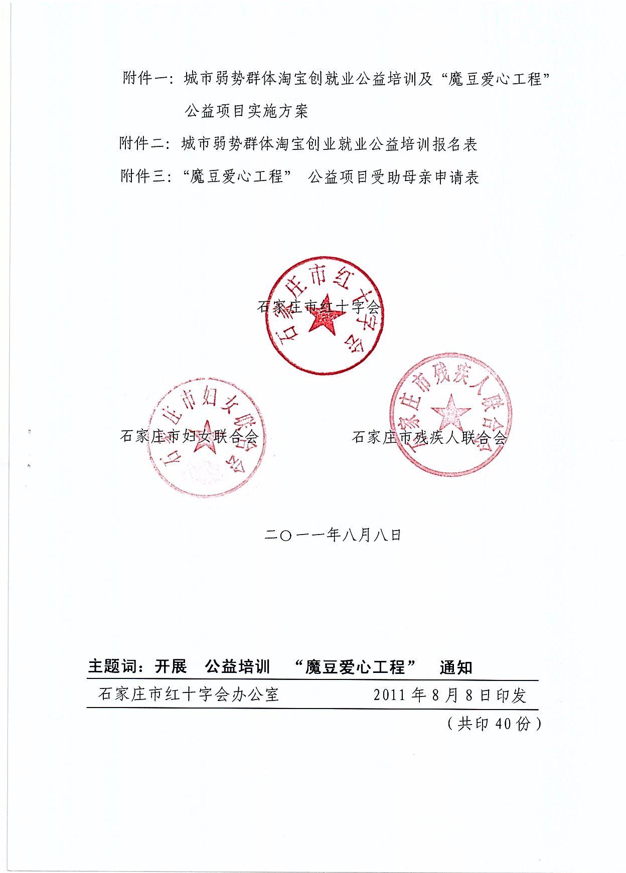 2010年9月中国红十字会总会与淘宝网共同设立“中国红十字会淘宝公益基金”,今年该基金启动“城市弱势群体淘宝创业就业公益培训项目”即向城市弱势群体提供系统的公益培训,帮助他们在淘宝上创业、就业。“魔豆爱心工程”是由总会与淘宝网合作开展的公益项目,通过为处于困境的母亲搭建淘宝网店以获得维持正常生活的稳定收入,以“授之以渔”的永续方式替代“受之以鱼”的一次性捐助。是一项旨在帮助自强自立的困难母亲改变命运的再就业工程。为了进一步扩大这俩项公益项目的影响力,充分发挥项目作用,使更多的弱势群体能参与进来,石家庄市红十字会联合石家庄市妇女联合会、石家庄市残疾人联合会共同开展此次项目。