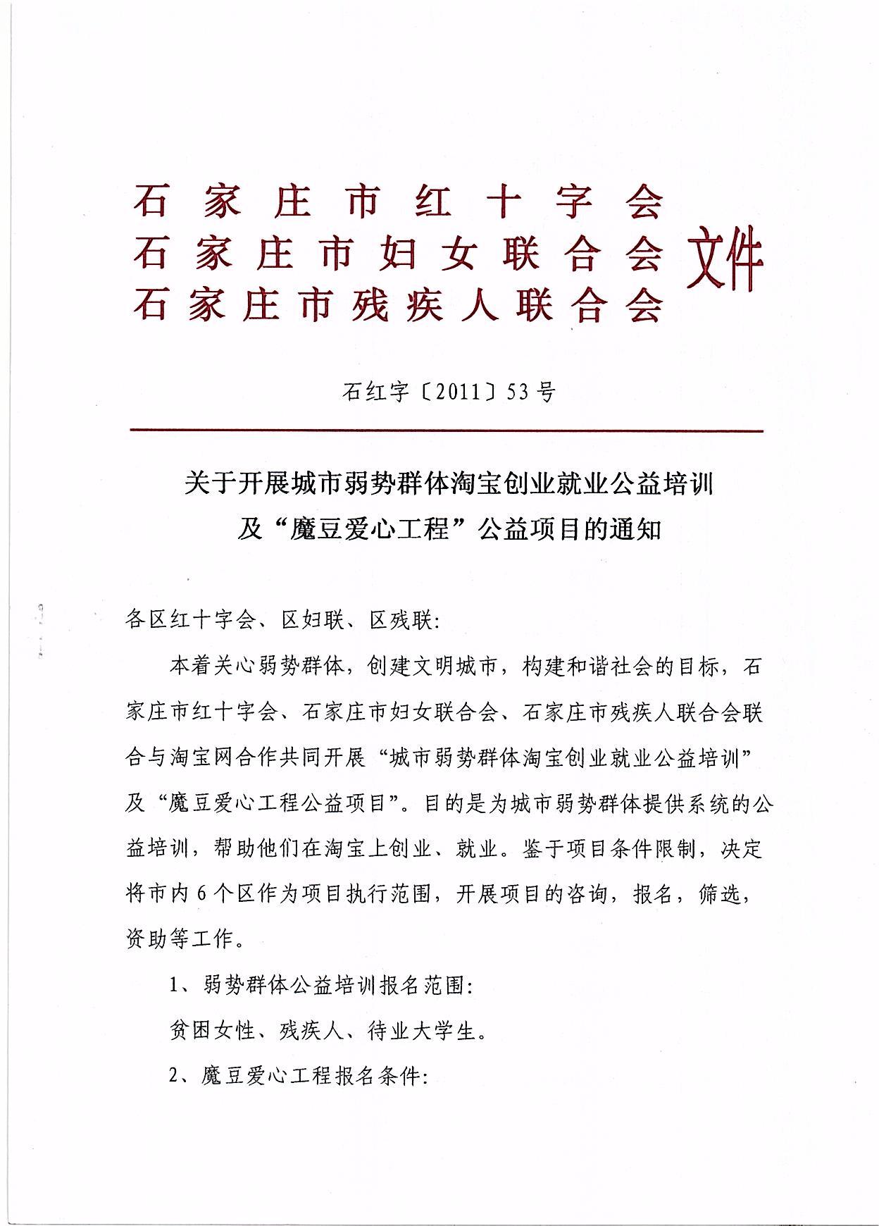 石家庄市红十字会开展城市弱势群体淘宝创业就业公益培训及“魔豆爱心工程”公益项目
