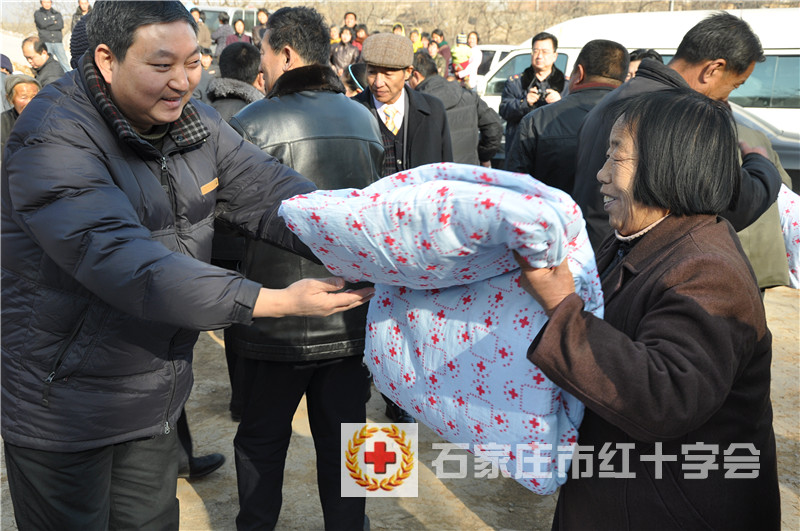 1月13日,石家庄市红十字会副会长张玉安参加了由石家庄市老区建设促进会 、石家庄市工商局、石家庄市红十字会联合在赞皇县黄北坪乡长沙村、上桃坡村开展的助困送温暖活动,并带去80条棉被送到贫困老百姓手中。