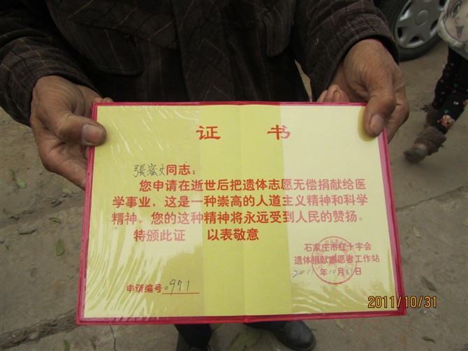 井陉县红十字会秘书长仇珺介绍,据了解,张密文是在井陉县红十字会登记的首个农民遗体捐献者。近年来,很多人都对捐献遗体有了新的认识,签订遗体捐献协议的人数也在逐渐增加,但其中绝大部分都是受过高等教育或有一定社会地位的人。在农村,因受教育程度和传统观念的影响,像张密文和袁庆来这样的农民遗体捐献者极少。