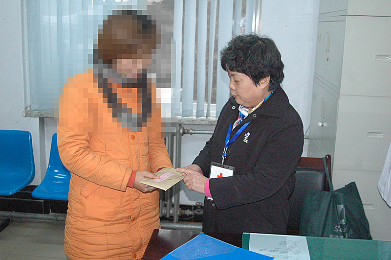 市红会常务副会长解晓芒(右一)发放救助金