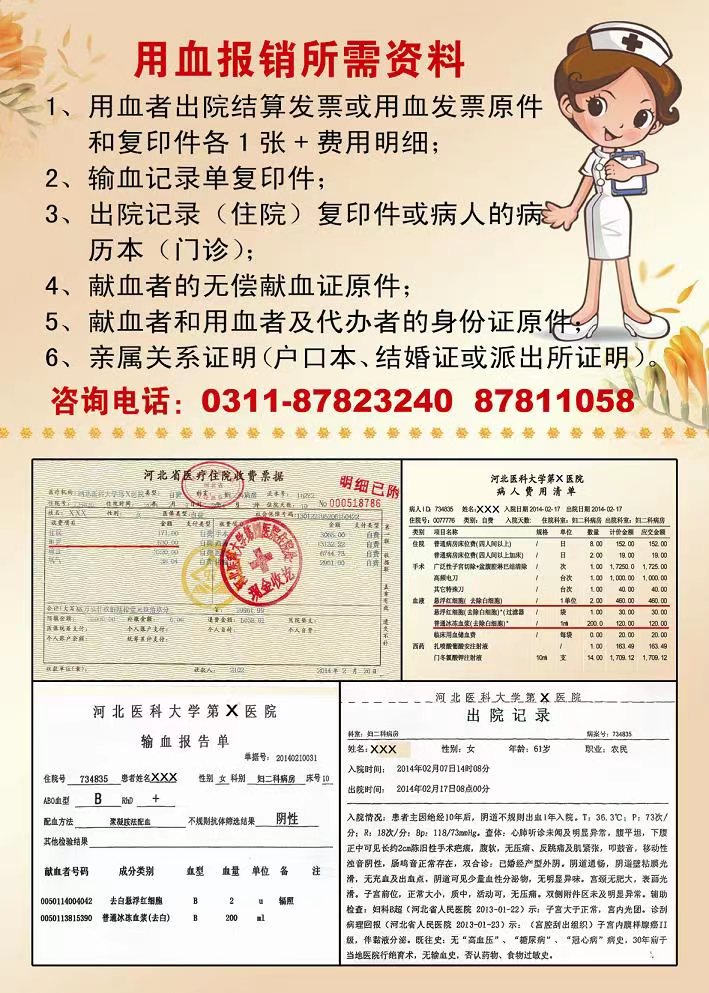 献血者可到河省血液中心报销血费,地址:石家庄市和平西路299号。具体流程如下: