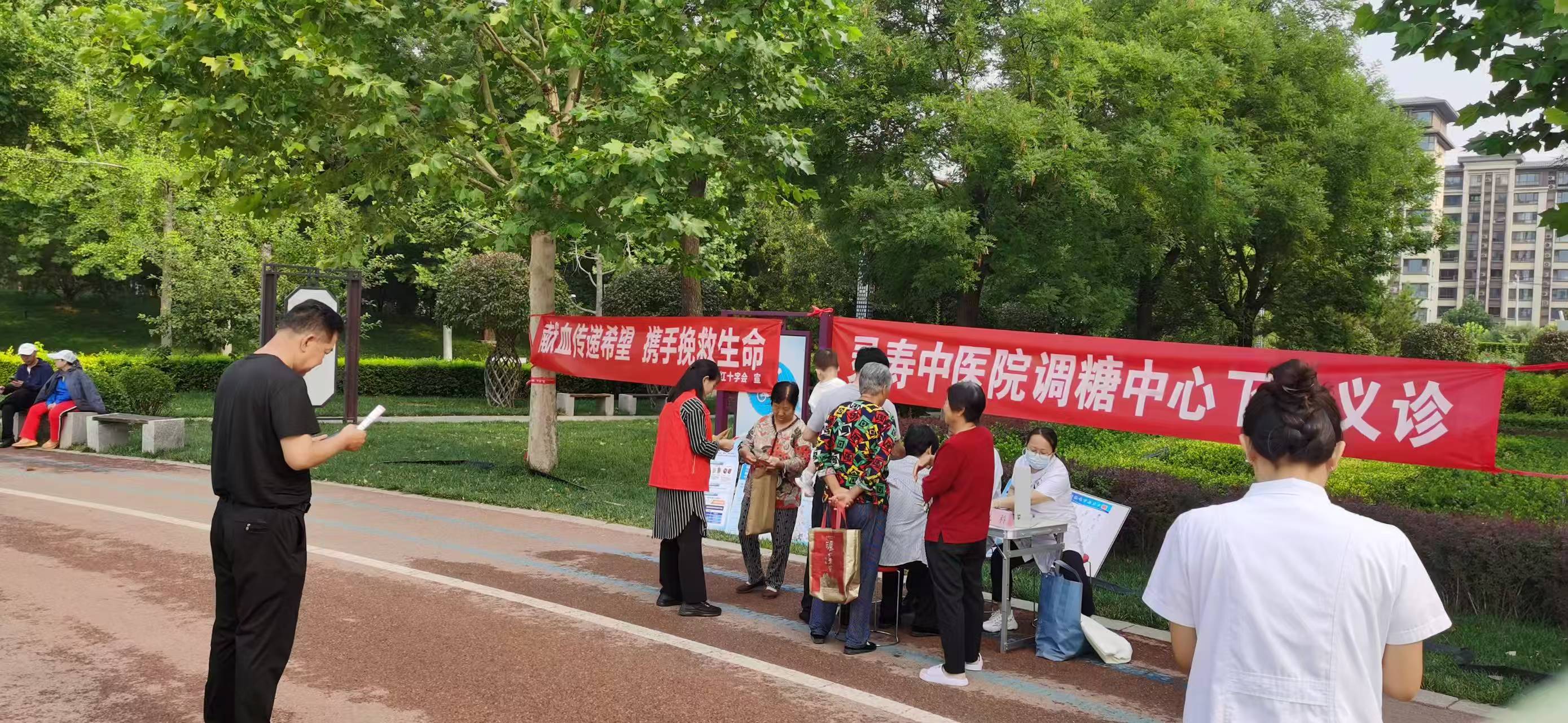 6月13日,灵寿县红十字会联合灵寿县中西医结合医院,组织无偿献血志愿服务大队及医院专家团队志愿者,在松阳河下沉广场开展义诊、健康咨询及无偿献血知识宣传等志愿服务活动。活动中,志愿者认真讲解无偿献血及捐献造血干细胞相关政策及常识,并发放宣传资料;医院专家们耐心解答前来咨询义诊的百姓,对常见病、多发病给予详细的用药及诊治指导,调糖中心的专家还对血糖较高的患者现场检测血糖,并给予慢性病的调理指导。百姓们纷纷表示学到了很多以前不了解的无偿献血常识及临床用血报销政策,并在晨练同时接受到了医院专家的专业诊疗指导,很方便很受益。