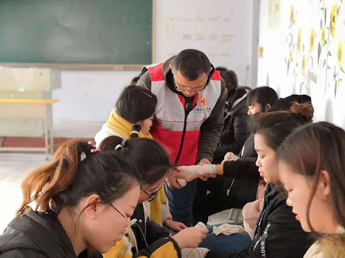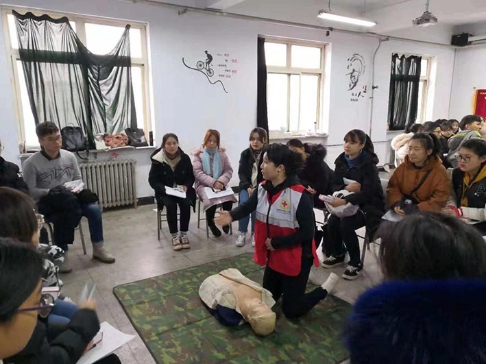 理论课程主要分心肺复苏和创伤救护两部分。红十字应急救护师资首先为大家展示了进行心肺复苏术的全过程,详细演示了仰头举颏、开放气道、胸外按压、人工呼吸、复原体位等心肺复苏技术,并在几个重要的细节上反复讲解示范。之后就突发事件后的应急措施、包扎知识以及自护自救的包扎技巧进行了讲解。专业的讲解和形象的示范,博得了学生们阵阵掌声。